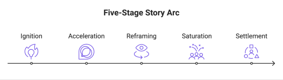 Acceleration: Platform engines amplify the initial narrative based on engagement, causing velocity to compound. Pre-planned communication cadence is crucial here. Sporadic updates get outpaced.