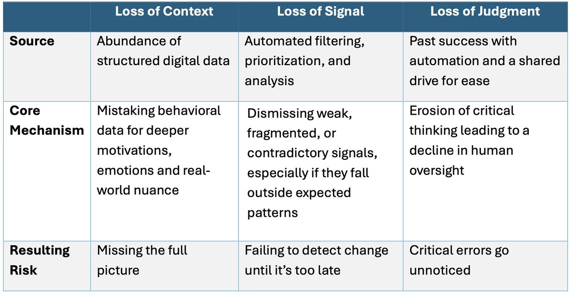 This third trap doesn’t begin with blind spots in the data (Loss of Context), or with weak signals automated system fail to detect (Loss of Signal). It begins with a human choice: the decision not to question.