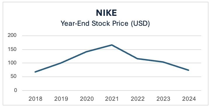 The share price illustrates the story: from a peak of $167 in 2021, Nike lost over half its market value by the end of 2024, reflecting investor concern.