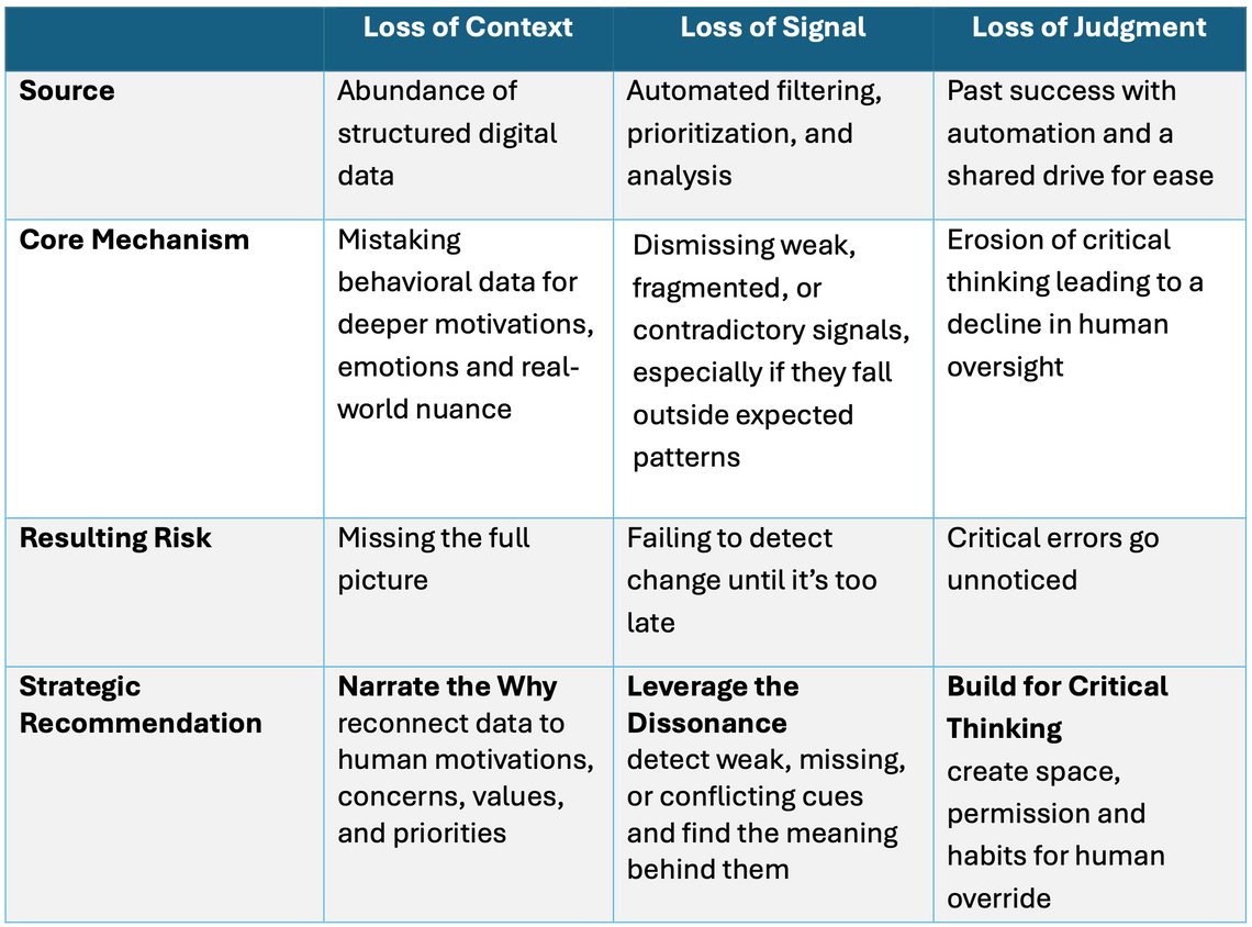 Loss of Context occurs because accurate, structured digital data is detached from the messy, situational reality it’s meant to represent. In environments driven by standardized metrics such as conversion rates, CRM funnels, and the continuous measurement of digital behaviors, organizations often confuse the map for the terrain. They begin to treat data as reality, rather than a filtered translation of it. This confusion grows deeper as automation speeds up reporting, making it even harder to notice when depth is missing behind the numbers.