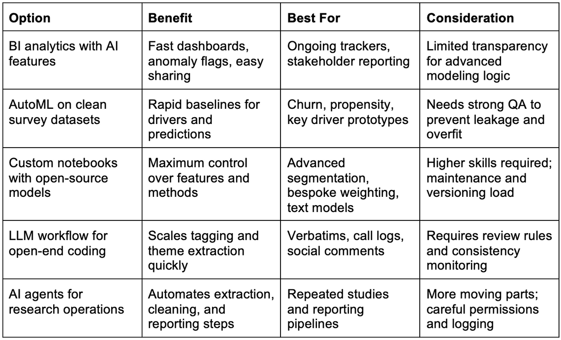 Add AI where it supports researchers, not replaces judgment: Use AI integration strategies that keep humans in the loop, AI drafts, you approve. For example, have AI propose segments, drivers, or themes, then require a reviewer to validate with cross-tabs, raw verbatims, and logic checks before anything reaches stakeholders. This approach protects methodological integrity while still cutting the “blank page” time.